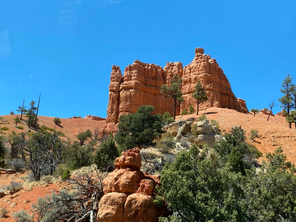We passed “Thunder Mountain” (the basis for Disney’s “Big Thunder Mountain”) in the dark on the way in, so we decided to take a route to Moab that took us back through that way to get a better view in the daytime. They have two arches in the road to drive through on the road between Hatch and Bryce, which is fun.