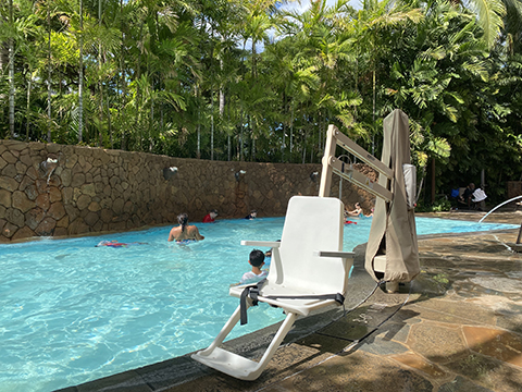 Every pool and hot tub has a device for lifting someone who cannot transfer from their chair into the pool or hot tub.