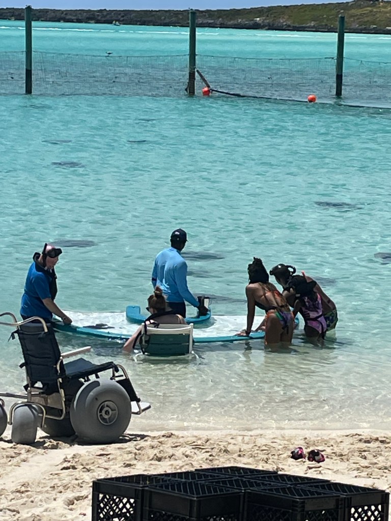 Was really nice and very accessible (pretty much the only Castaway Cay experience that was). I transferred to a beach wheelchair to get down there, and from the beach wheelchair to a chair in the water for the ray encounter. They swim up on a little platform and you can touch and feed them. It all take place in water shallow enough to sit in a chair in. Those who are able can swim with the rays and snorkel (the snorkel equipment comes in the experience package.