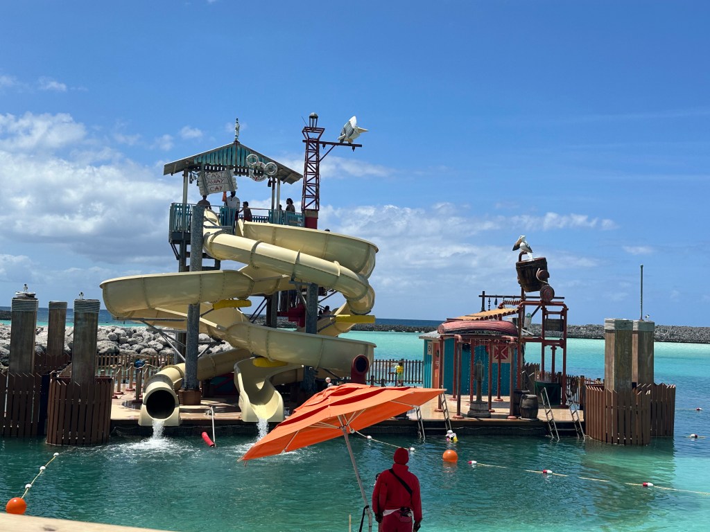 Is a waterslide area by the kid beach. You have to be able to swim up to it to do it. There is a viewing area where you can watch whoever is sliding down (where photo is taken from).
