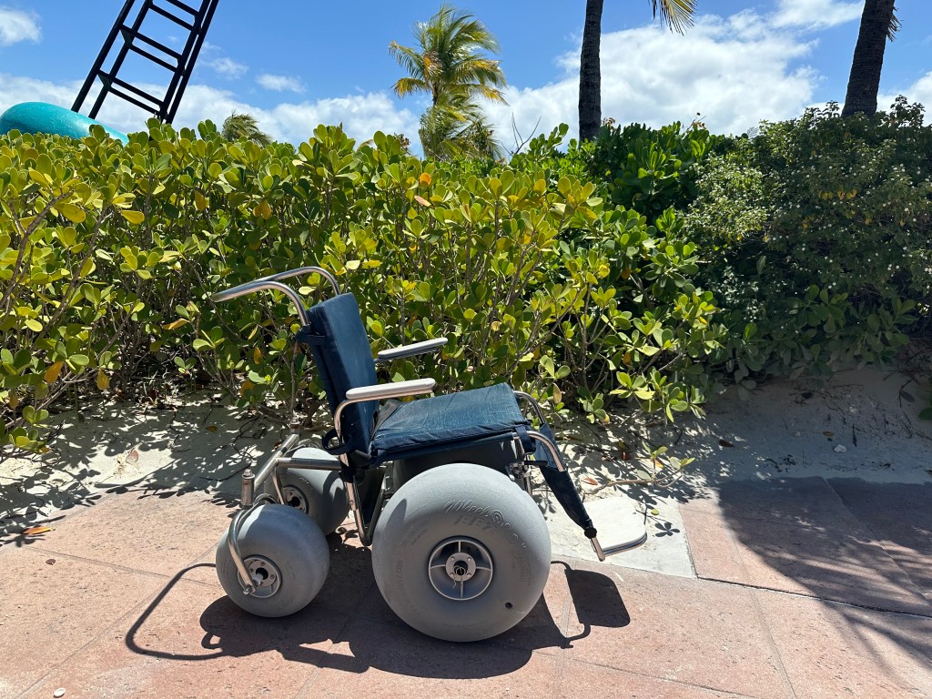 Were available basically near the first beach. There were a lot of them and they did not rent out, but if your voyage is very full I imagine they could. They require a suitably able/athletic person (or two) to push uphill on the beach. You basically park your chair somewhere (I picked a spot near where cast members were stationed) and take the beach chair onto the beach.